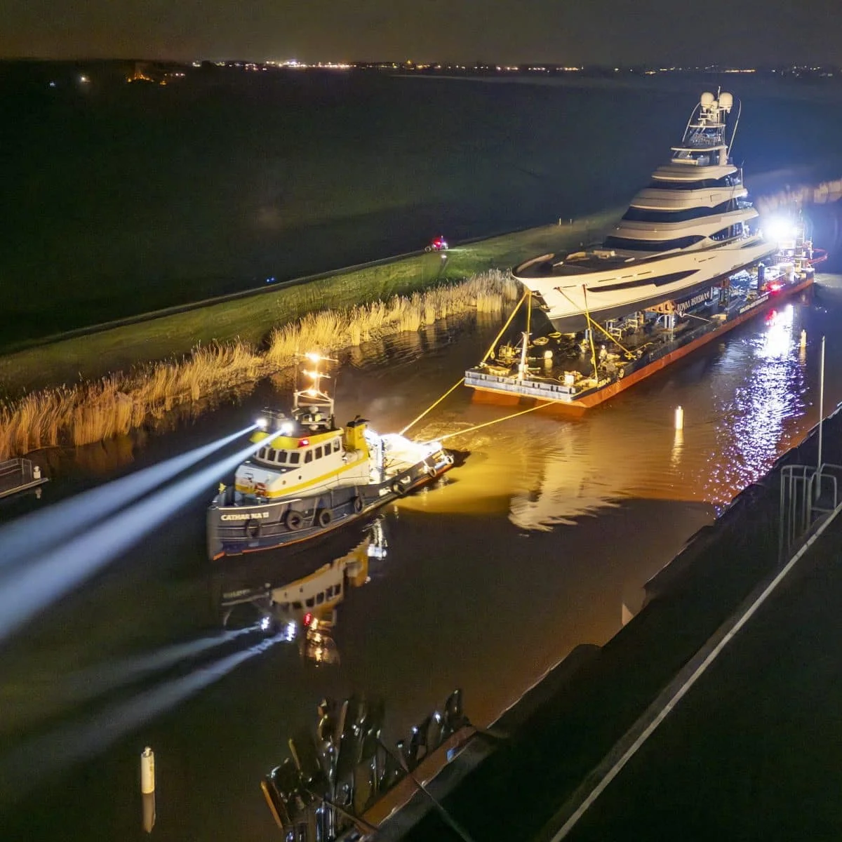 The ground-breaking big fisher, Royal Huisman's Project 406, is in transit from the shipyard's inland new-build facilities. in Vollenhove, gearing up for the anticipated final stage – her launch in Amsterdam. The powerful hull of this unique vessel measures 52m / 171ft overall and her towering profile accommodates six decks. These remarkable features not only make her the largest, but also the most luxurious and individual true sportfish yacht in the world: the ultimate expression of personal freedom.
