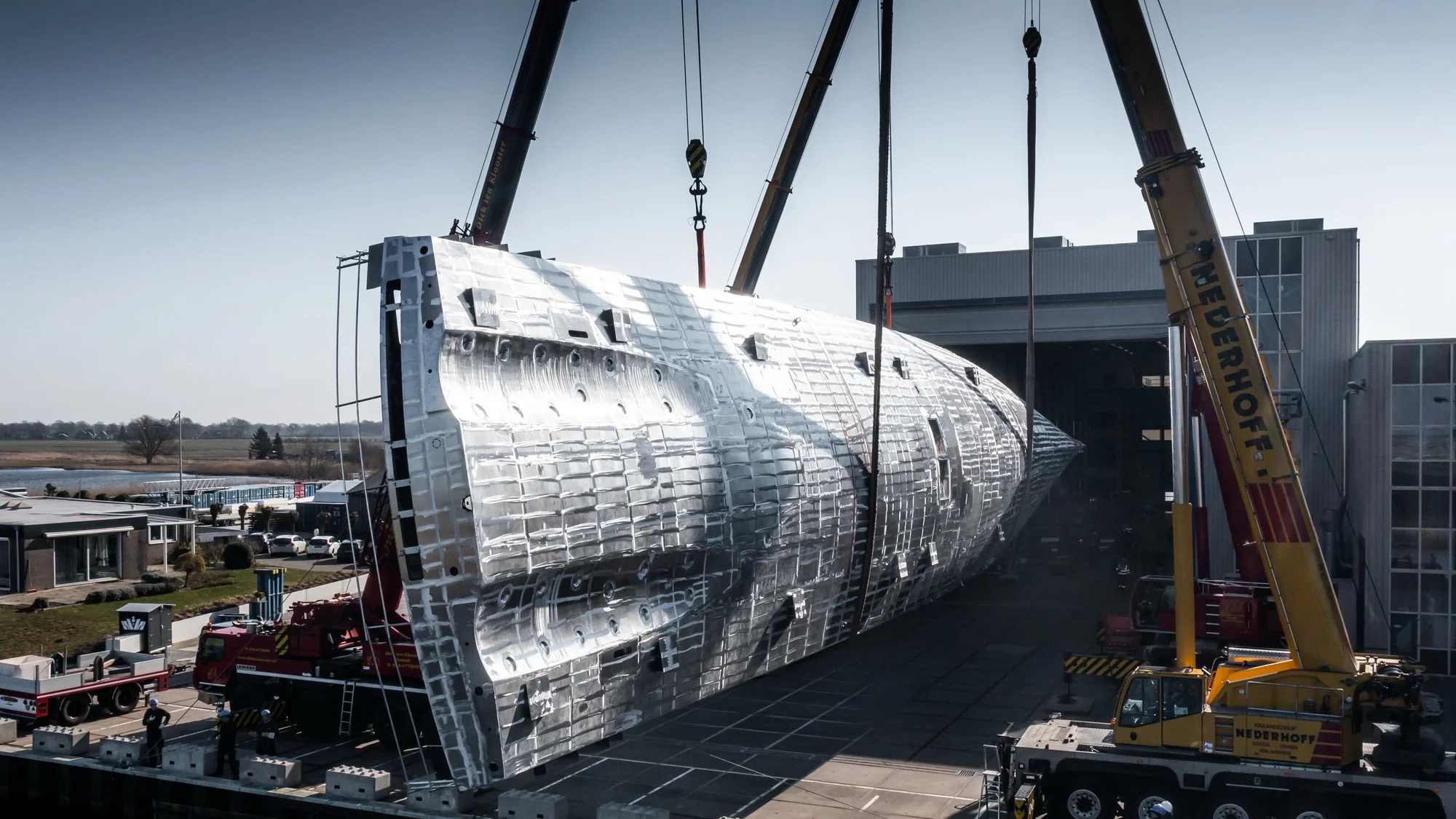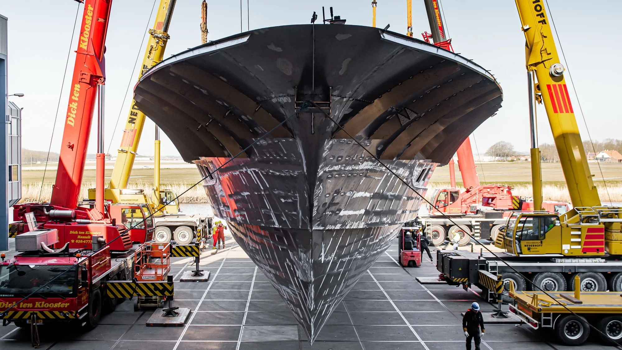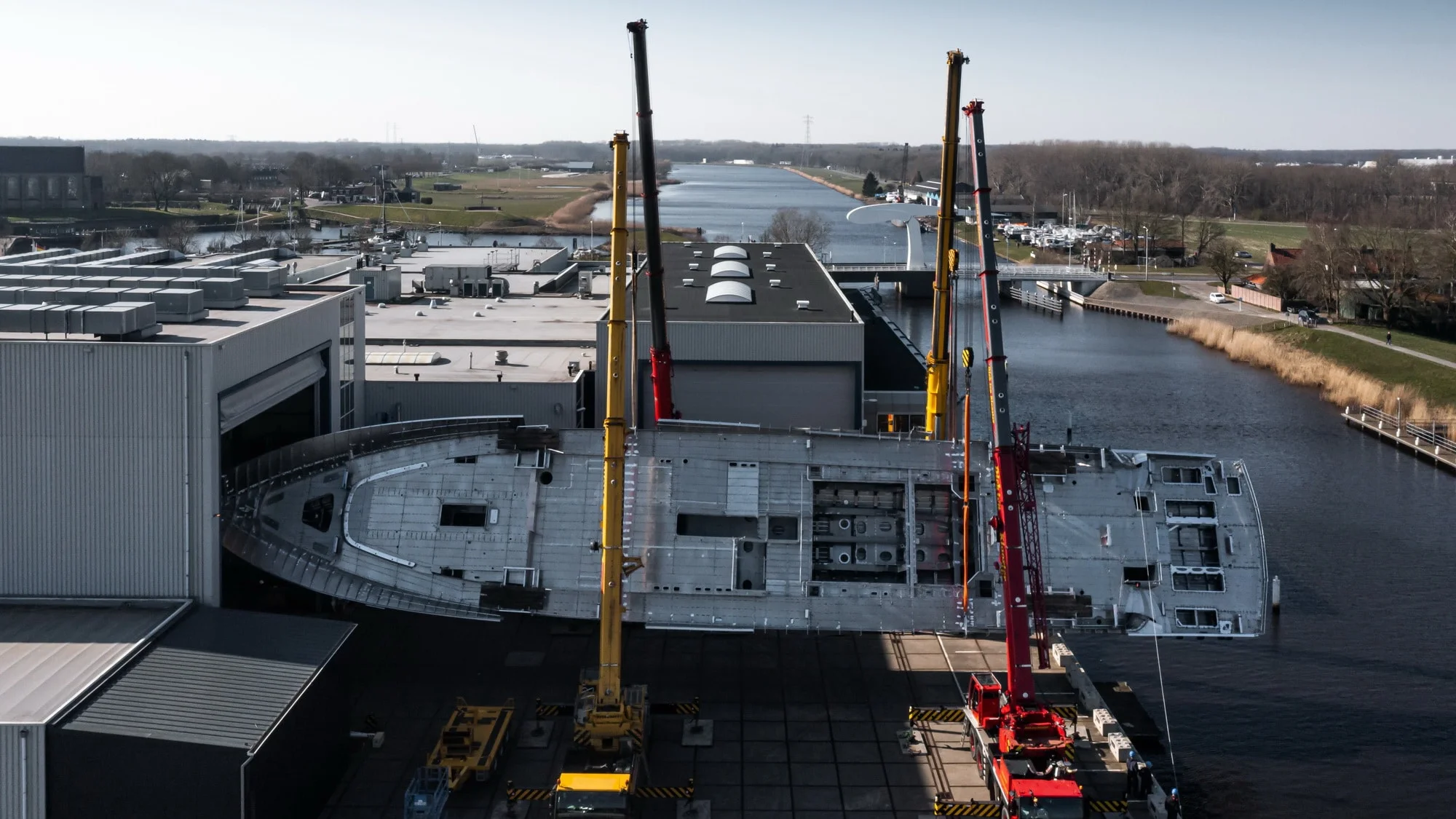 An important milestone in the creation of a truly exceptional superyacht was marked on 11th March when the hull of this 52m / 171ft luxury sportfish yacht was turned at Royal Huisman’s newbuild headquarters in Vollenhove, the Netherlands.