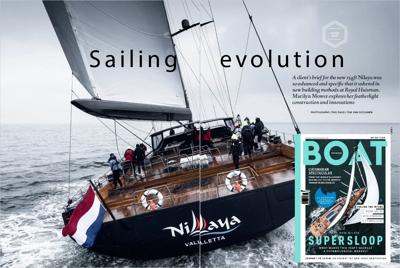 Boat International US cover story: "A client’s brief for the new 154ft Nilaya was so advanced and specific that it ushered in new building methods at Royal Huisman. Marilyn Mower explores her featherlight construction and innovations.”