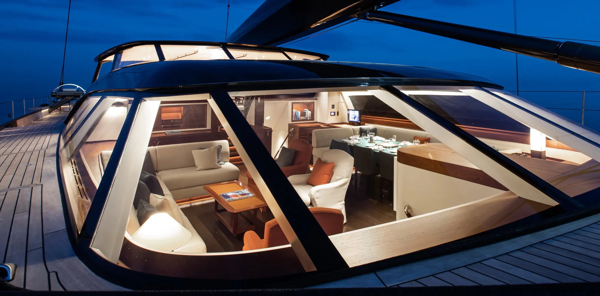 Mindful of the mission to cruise as well as race, Nauta Design developed three distinct outdoor guest areas in addition to the twin helm positions. The almost 33ft-wide transom includes a hinged section that folds hydraulically to form a staircase that lifts out of the way to launch the crew tender. On the aft section of the cockpit are two innovative sun loungers that adjust to compensate for the yacht’s heel. Removable railings from the transom to the guest cockpit guarantee that crew and guests are never more than two steps from a grab rail.