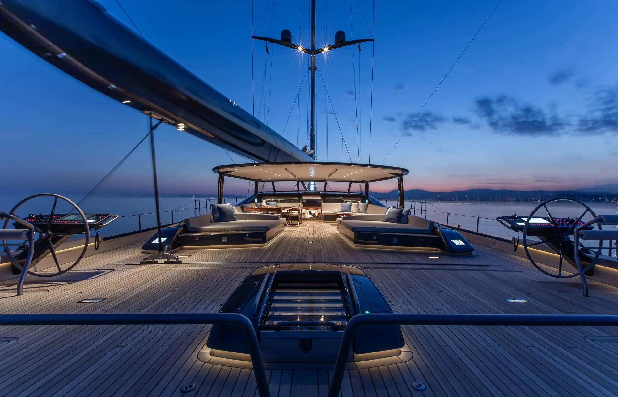 The guest cockpit, meanwhile, is shaded by a carbon composite hardtop with windows. Under this, the dining table can extend to seat 14 guests. Finally, the foredeck features a partially recessed tender bay that can become a cozy cockpit at anchor with a hi-lo table and fitted cushions. An awning can be strung from carbon fiber poles that store in a deck hatch.