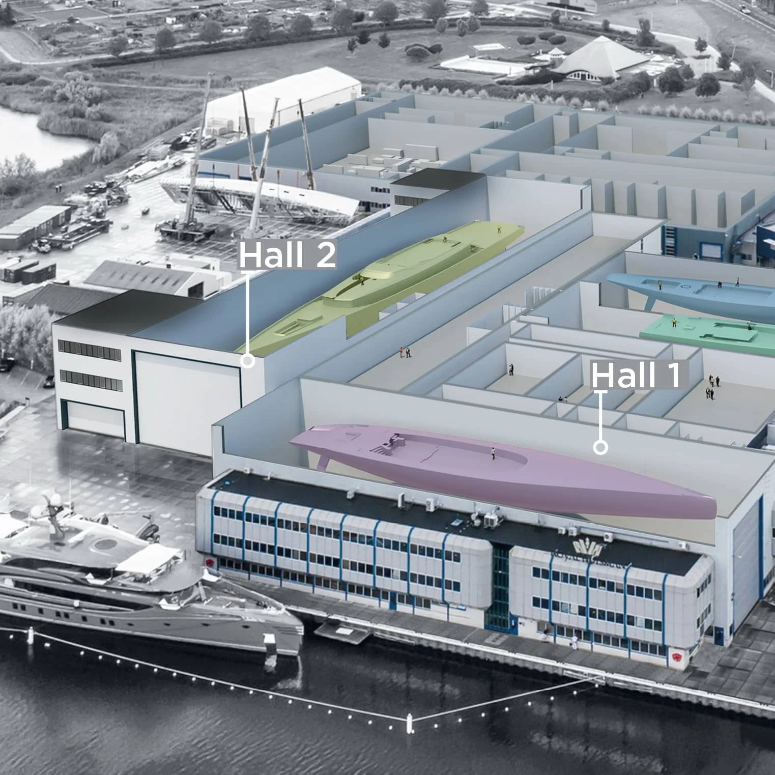 The shipyard facilities were extended to the Amsterdam region. This added 12.000 sqm / 129.200 sqft to the available capacity. This area is easily accessible from open sea and comprises three modern and heated main halls and a 120m / 394ft deep water quay…