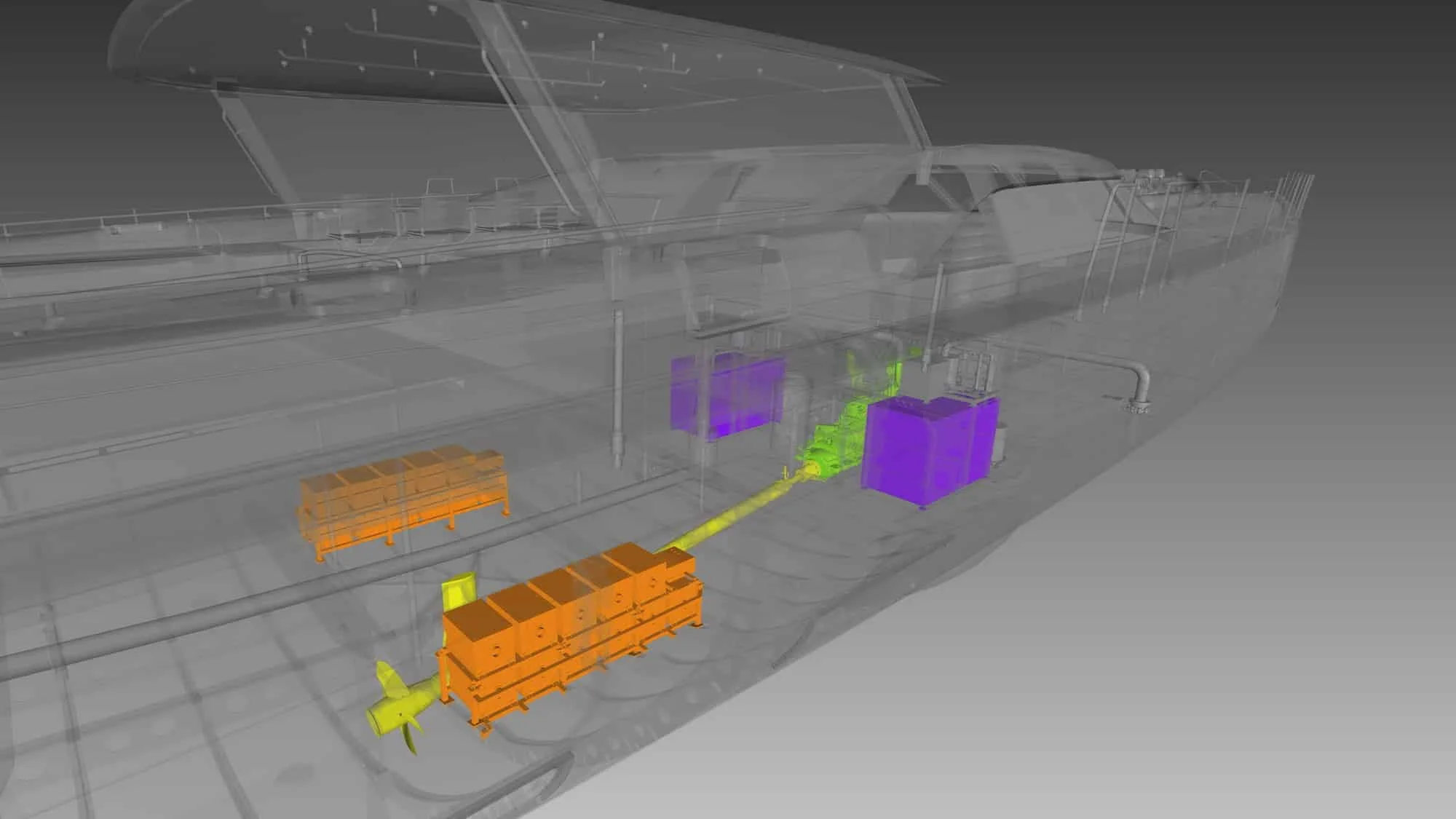 Royal Huisman used Finite Element Analysis (FEA) of Nilaya’s 3D model to fine-tune the engineering to “a much higher level,” according to naval architect Jim Pugh, adjusting plate thickness in the computer and predicting longitudinal stiffness or deflection without so much as touching that first piece of material. But it wasn’t just the engineering teams for carbon and aluminum structure that were involved. Royal Huisman created a new method of operation for Nilaya that kept all parties in the loop and working together from the outset.