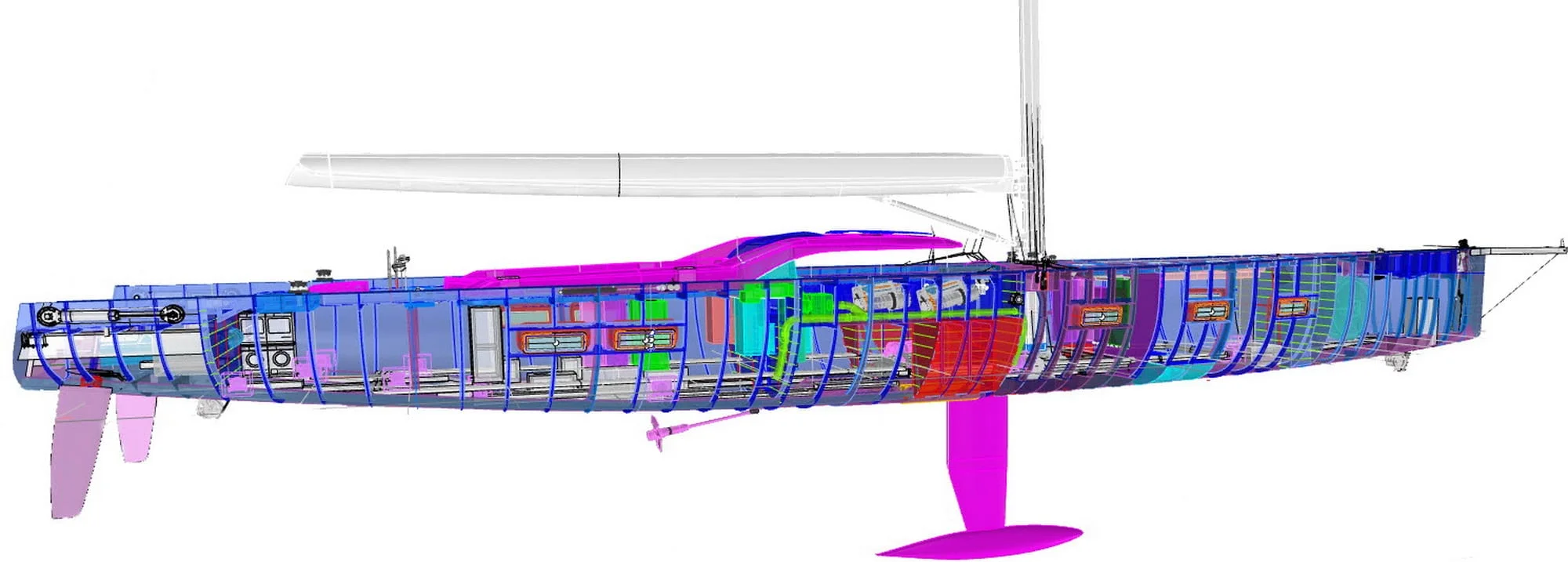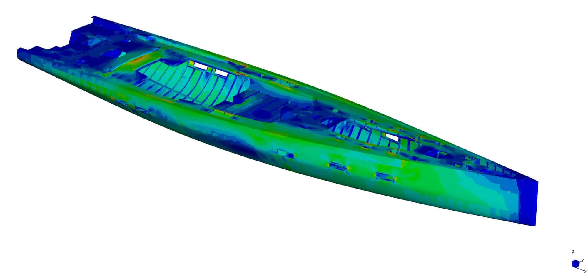 “Bringing in the mast and sail designers early in the process has significant advantages,” said Jim Pugh. “From the aero CFD side, Rondal and the sail designers shared high quality data about sail forces and sail loads that we integrated into the hydro CFD studies of the candidate hulls. This markedly improved the quality of the CFD hull testing and the resultant performance prediction. The mast and sail loads were then input into the hull and deck’s structural engineering,” said Pugh. “These studies are applicable to any design whether Featherlight™ or heavy, no matter the thickness of the plate or weight of the composite, such a study will yield remarkable results.”