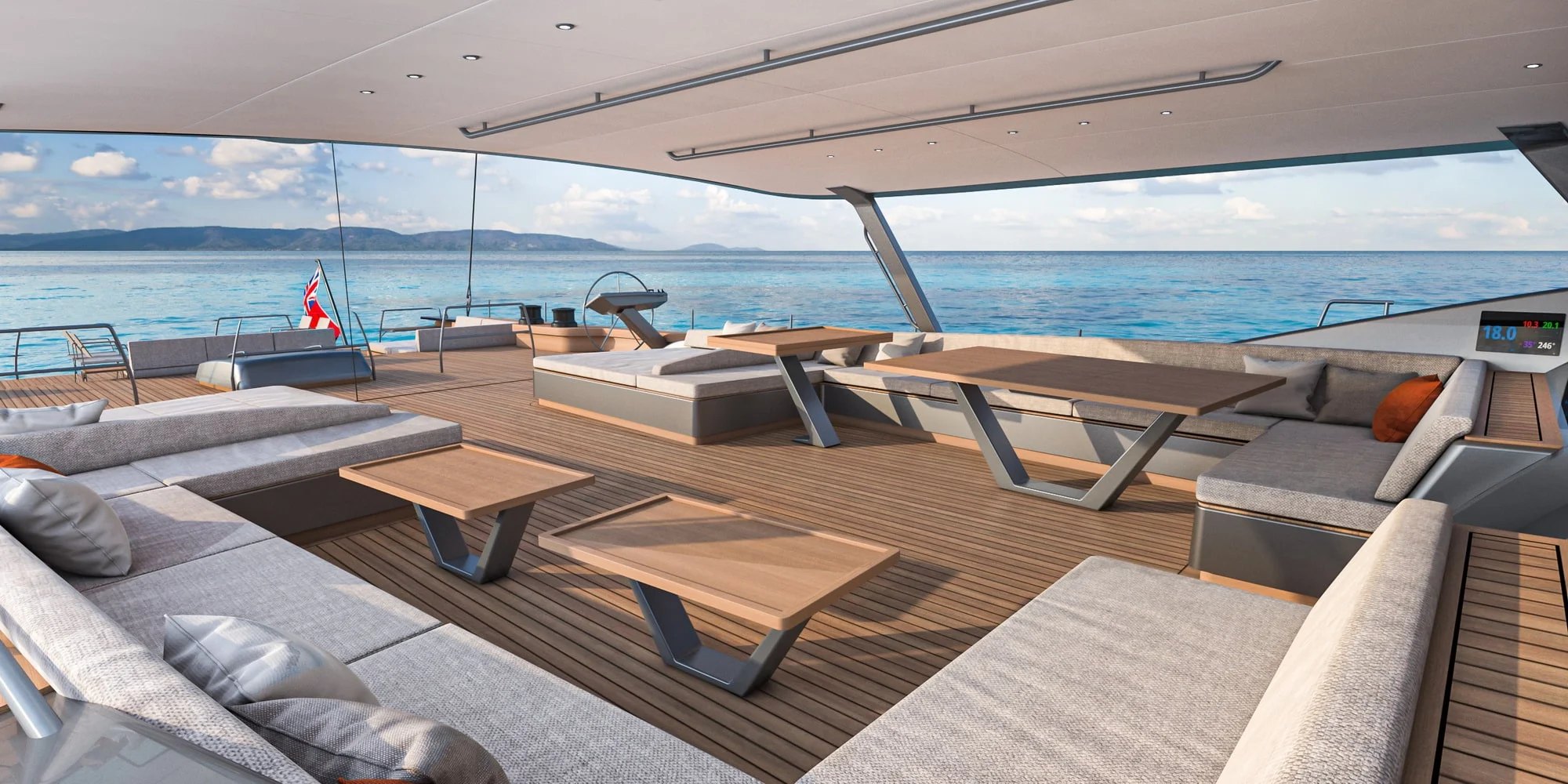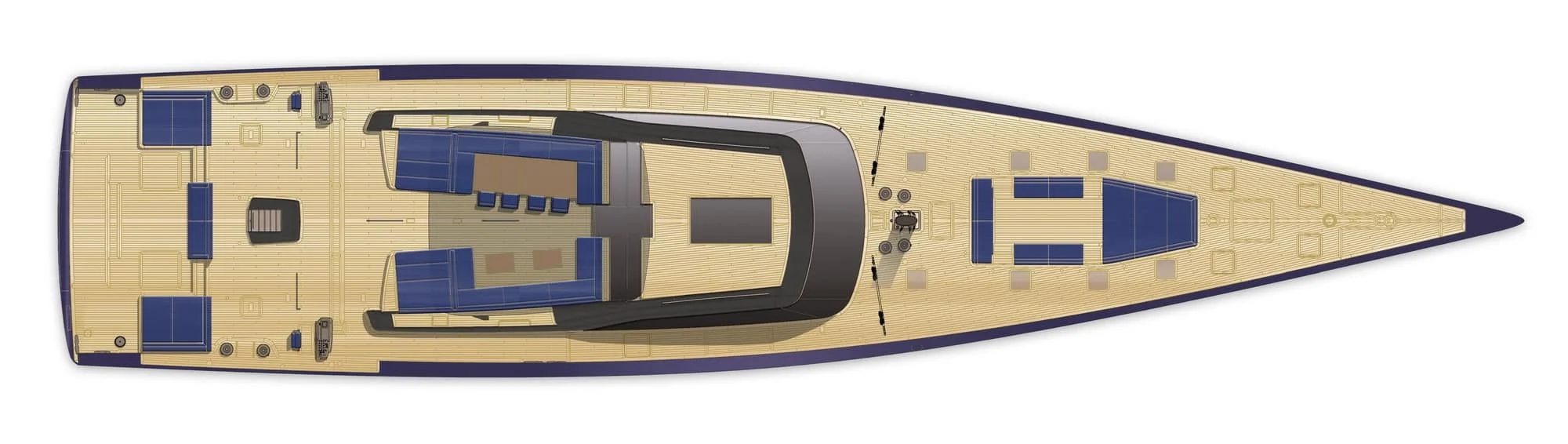 Developing the deck and cockpit perfectly for the dual purposes of cruising with family and friends and regatta racing was very important to the owners, according to Pedol. “Royal Huisman constructed a 1:1 mock up of the entire aft half of the yacht for finetuning all the aspects from sail controls and steering pedestals to the dining table, seatback angles of sun loungers and the step to the aft deck leading to the swim platform. Checking sightlines over the coachroof from the helm positions received critical attention, even by simulating heeling angles.”