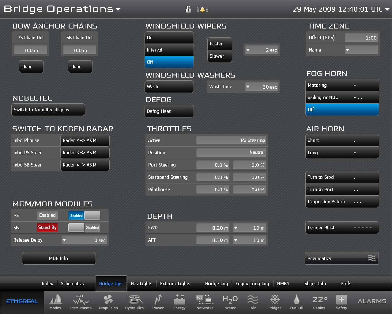 The Ethereal layout and interface of Royal Huisman's propriety Alarm & Monitoring system was developed in 2008: inspired by intuitive Apple-controls like a Macbook-like bottom row of icons and user-friendly switches of the iPhone (note the first-generation iPhone was launched late 2007).