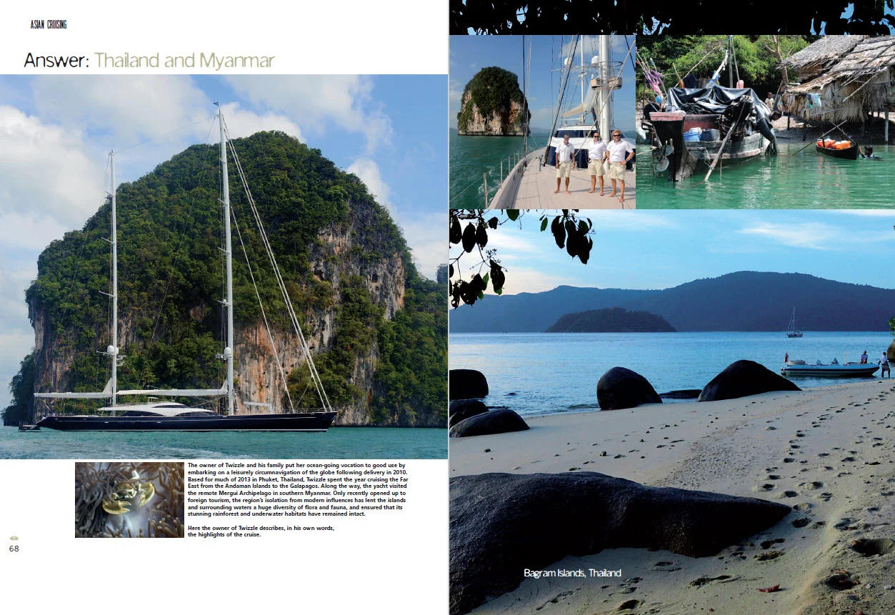 The owner of Twizzle and his family put her ocean-going vocation to good use by embarking on a leisurely circumnavigation of the globe following delivery in 2010. Based for much of 2013 in Phuket, Thailand, Twizzle spent the year cruising the Far East from the Andaman Islands to the Galapagos. Along the way, the yacht visited the remote Mergui Archipelago in southern Myanmar. Only recently opened up to foreign tourism, the region’s isolation from modern influences has lent the islands and surrounding waters a huge diversity of flora and fauna, and ensured that its stunning rainforest and underwater habitats have remained intact.