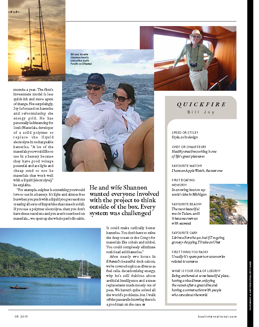 Today sees Joy still actively engaged in the investment sector, acting as principal and chief scientist of Water Street Capital, based in Jacksonville, Florida, in between his stints on board Ethereal, on which he spends around three months a year. The firm’s investment model is less quick-hit and more agent of change. Not surprisingly, Joy is focused on batteries and reformulating the energy grid. He has personally led financing for Ionic Materials, developer of a solid polymer to replace the liquid electrolyte in rechargeable batteries. “A lot of the materials you would like to use in a battery because they have good voltage potential and are light and cheap tend to not be materials that work well with a liquid [electrolyte],” he explains.
