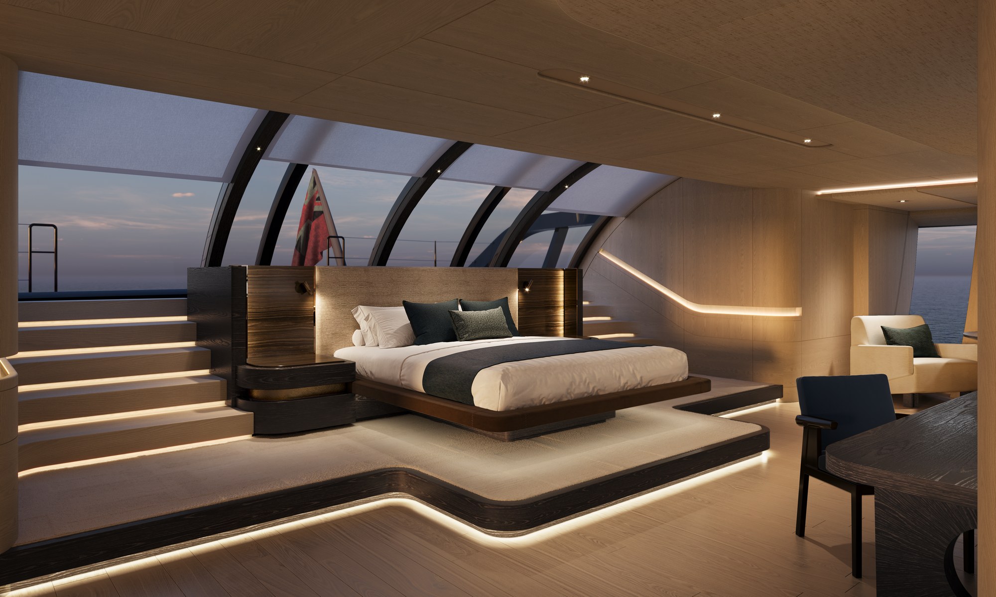 The interior, which is inspired by nature, accommodates ten to twelve owners and guests. SKY ’s interior styling will be an architectural sanctuary at sea, featuring clean, sculptural lines, natural textures and calm palettes refined with subtle luxury detailing. Blurring boundaries between inside and out, evoking coastal landscapes but through an elevated, architectural lens.