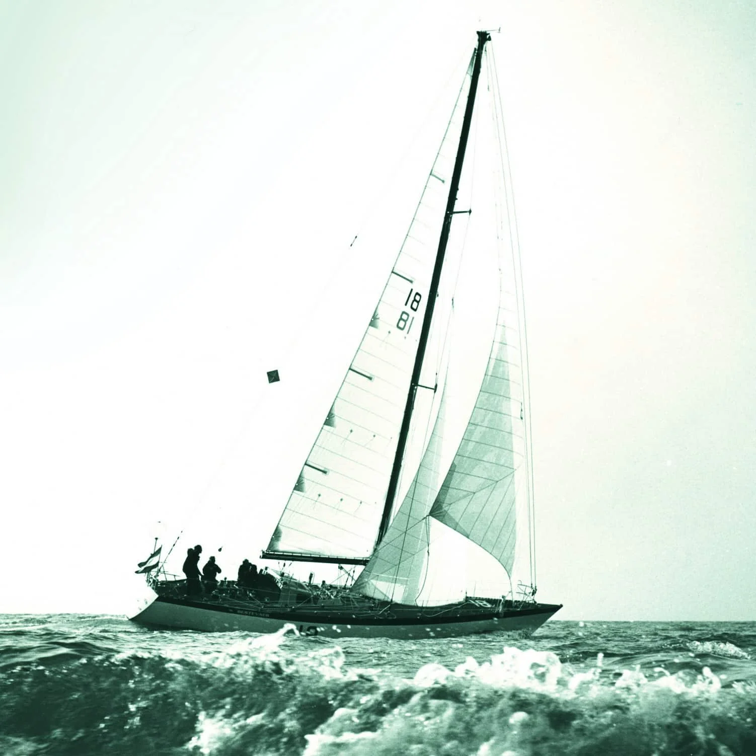 Spirit of Delft, a 13.4 m / 44 ft Admiral’s Cupper designed by Jac de Ridder and launched in 1973 is noteworthy because her owner, Willem Oosterwijk, enjoyed a close friendship with, and regular crewing from, Wolter Huisman over a period of twelve years. Many top sailors and designers made guest crew appearances aboard this actively campaigned yacht thanks to Wolter’s wide connections. Among many successes, she won Cowes Week in 1974.