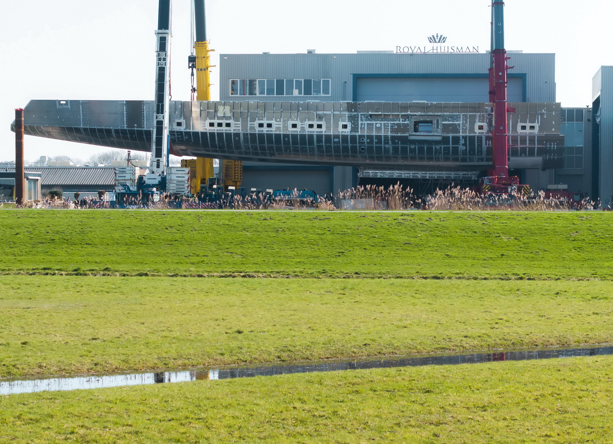 Following Royal Huisman’s announcement for its new XXL commission in May last year, the shipyard team will be turning the main part of the Trident series hull number 2 at its Vollenhove facility.