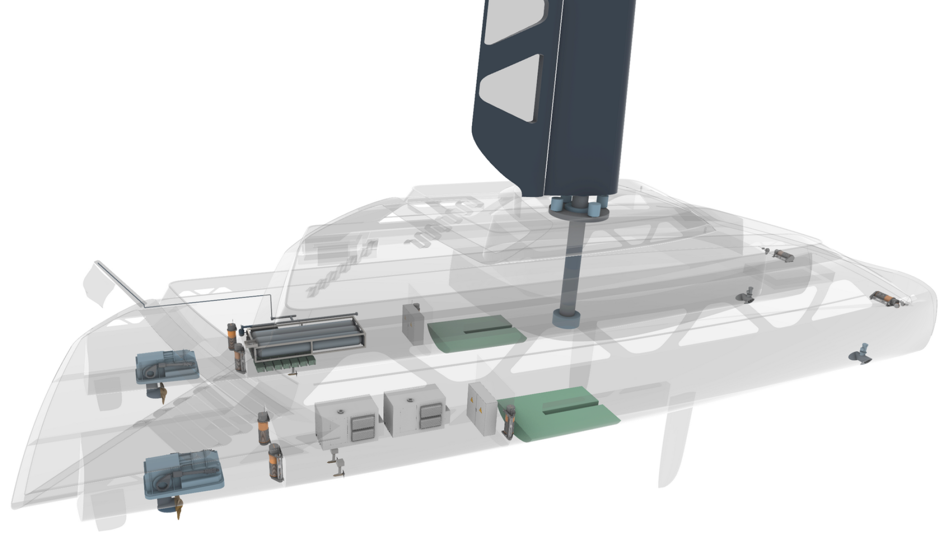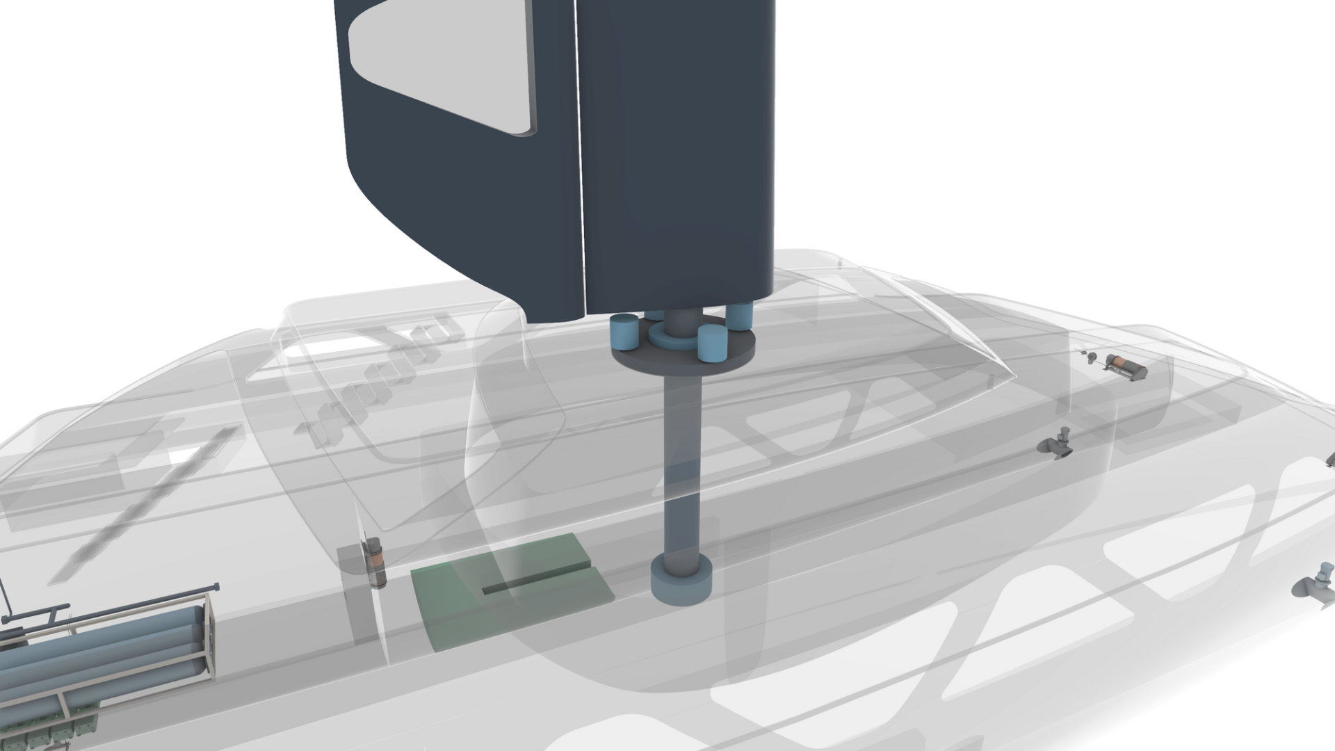 It has no additional sails to deploy or flap, and it requires no sheets, blocks, furlers, or winches on deck, nor captive reels taking up space below. Two electric motors housed around the mast column inside the yacht rotate the wing mast. Hydraulic cylinders control the adjustable flaps along its trailing edge to generate lift and forward momentum, or feather it completely in a neutral position by aligning with the breeze...
