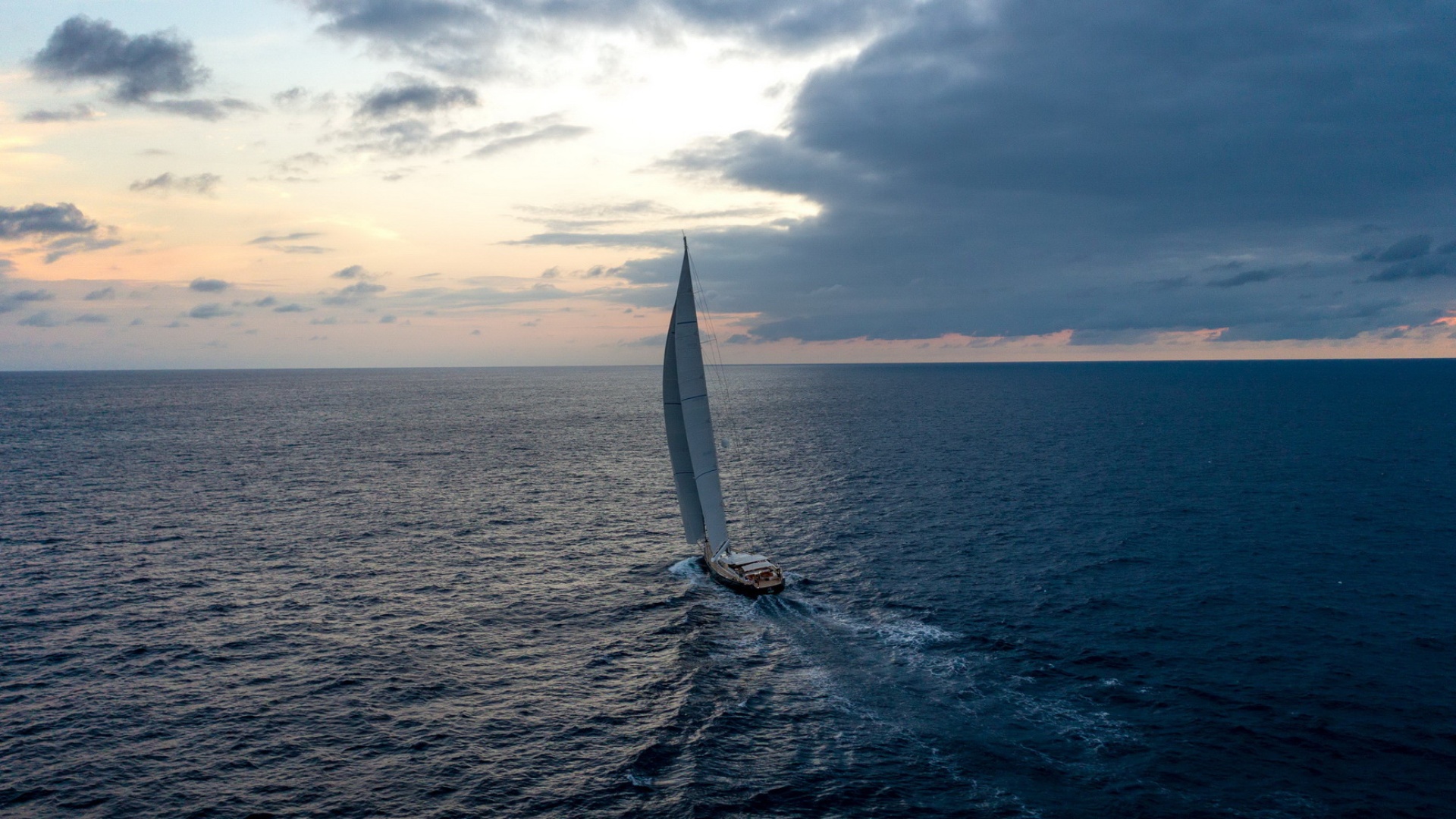 Sea Eagle (I), nowadays Ravenger, is designed and engineered to cruise the world and participate in the occasional superyacht regatta along the way. With her dark blue hull and “Chevy white” superstructure, the yacht is as stylish as she is performance oriented. With well-positioned sightlines, the twin helm stations offer a commanding view of the complete deck and sail plan whilst keeping everyone socially connected between the helm stations and her unique awning covered ‘tea deck’ dining area; the perfect place for outdoor dining or shaded seating under sail or at anchor.