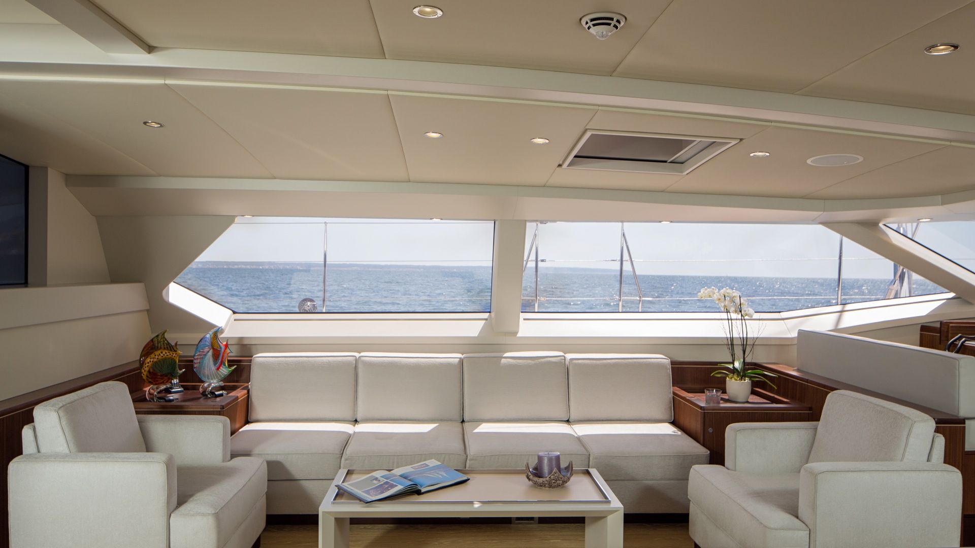 A special feature of Ravenger is also the aft ‘beach’ deck. Two steps lower than the main deck, from here the transom opens to reveal a large swim platform and full-beam staircase, where beach and platform become a water lovers’ playground. For a day of water skiing or diving, a large inboard tender can be deployed from the lower garage by way of a hydraulically-lowered stern slipway ramp. No less impressive is her interior, where quietly grained French walnut sets the scene for white oak floors, upholstered wall panels and birch wood accents to provide an atmosphere of comfort and easy living.