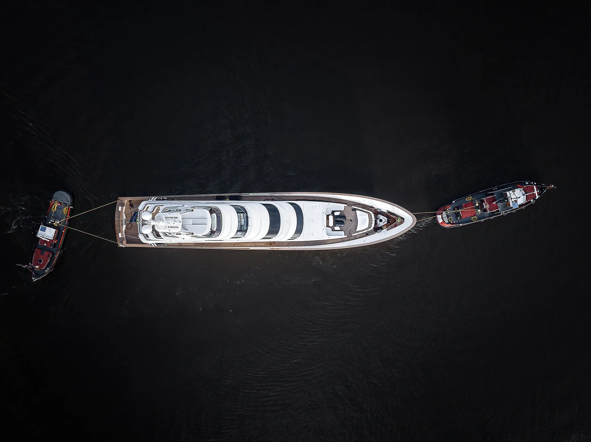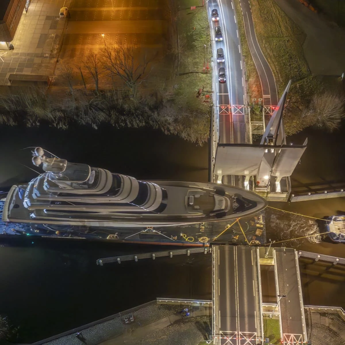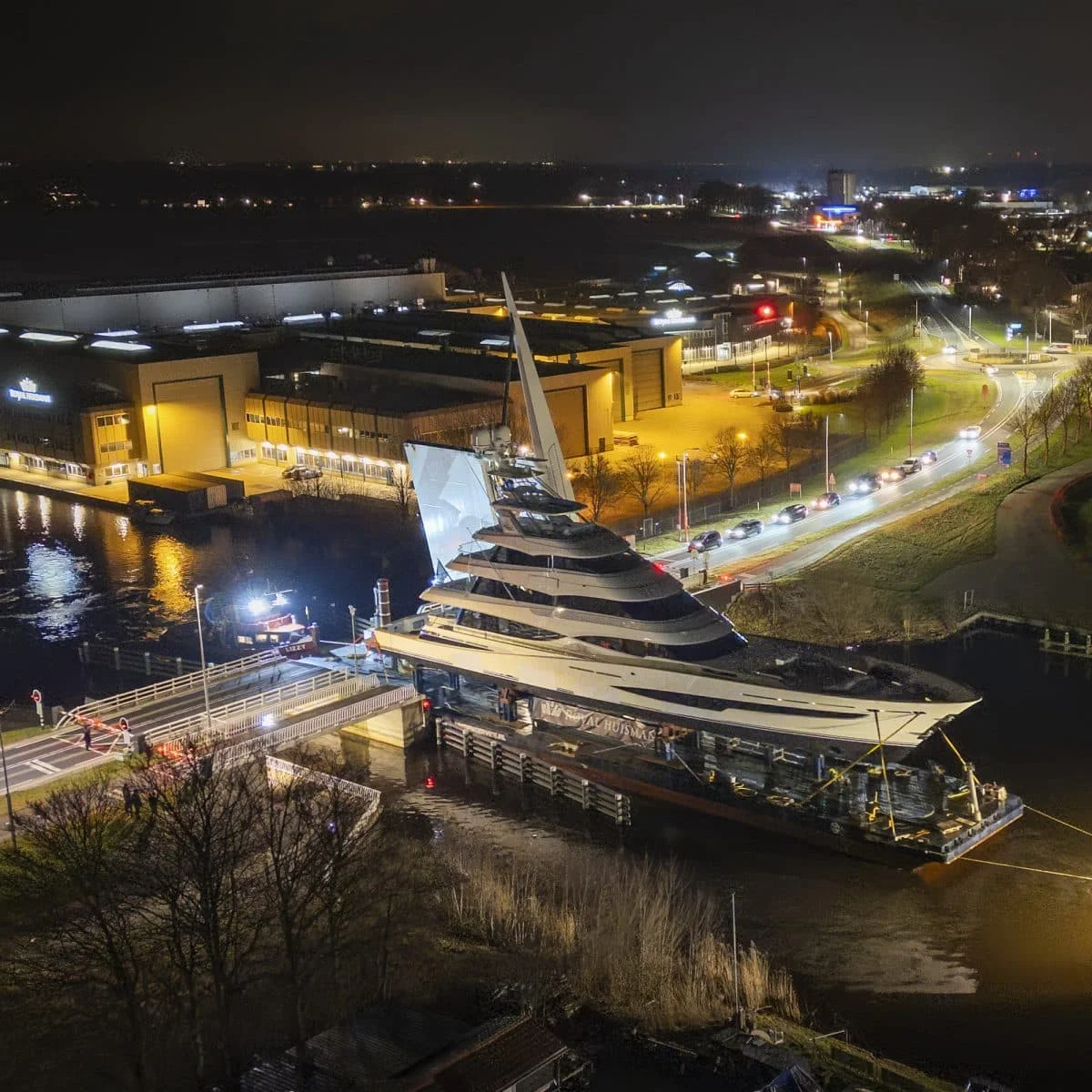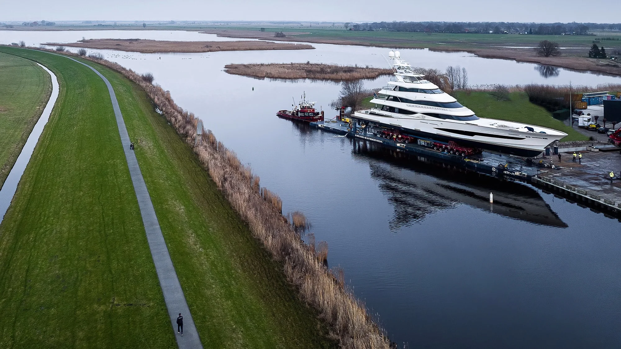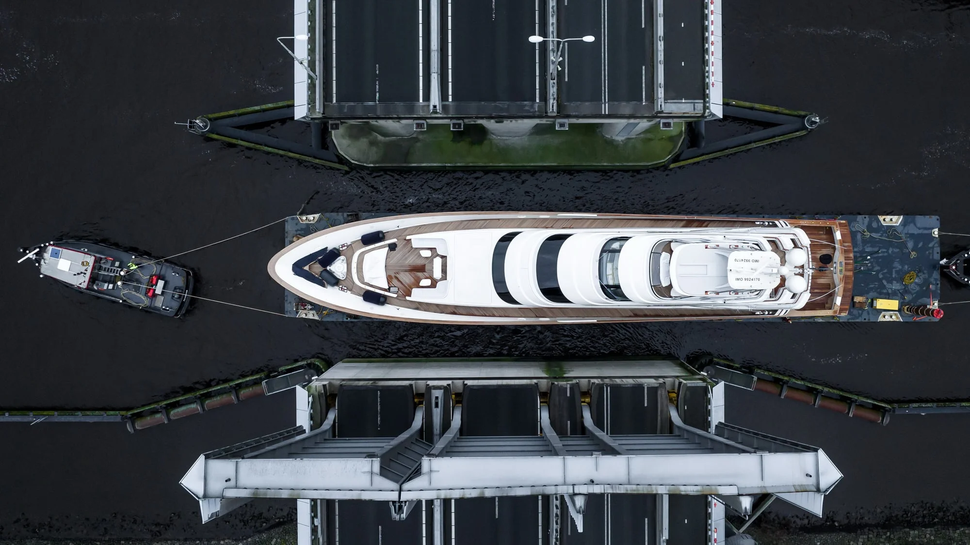 The ground-breaking big fisher, Royal Huisman's Project 406, is in transit from the shipyard's inland new-build facilities. in Vollenhove, gearing up for the anticipated final stage – her launch in Amsterdam. The powerful hull of this unique vessel measures 52m / 171ft overall and her towering profile accommodates six decks. These remarkable features not only make her the largest, but also the most luxurious and individual true sportfish yacht in the world: the ultimate expression of personal freedom.