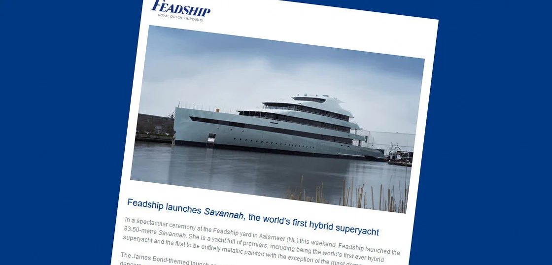 Screenshot from the 2015 press release “Feadship launches Savannah, the world’s first hybrid superyacht” [link: opens in a new tab]